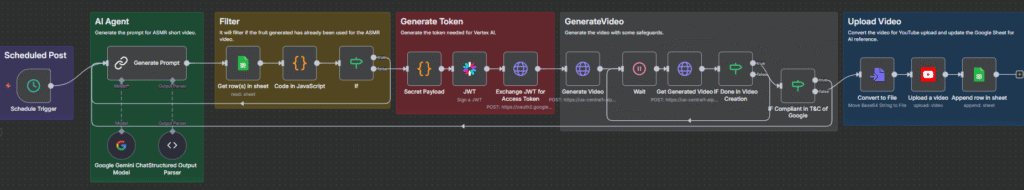 This project automates the creation and posting of ASMR-themed YouTube Shorts using AI-driven tools. It systematically generates unique video concepts (e.g., ASMR fruit slicing), ensures no repetition, produces videos via Vertex AI, and uploads them to YouTube while keeping detailed records in Google Sheets.